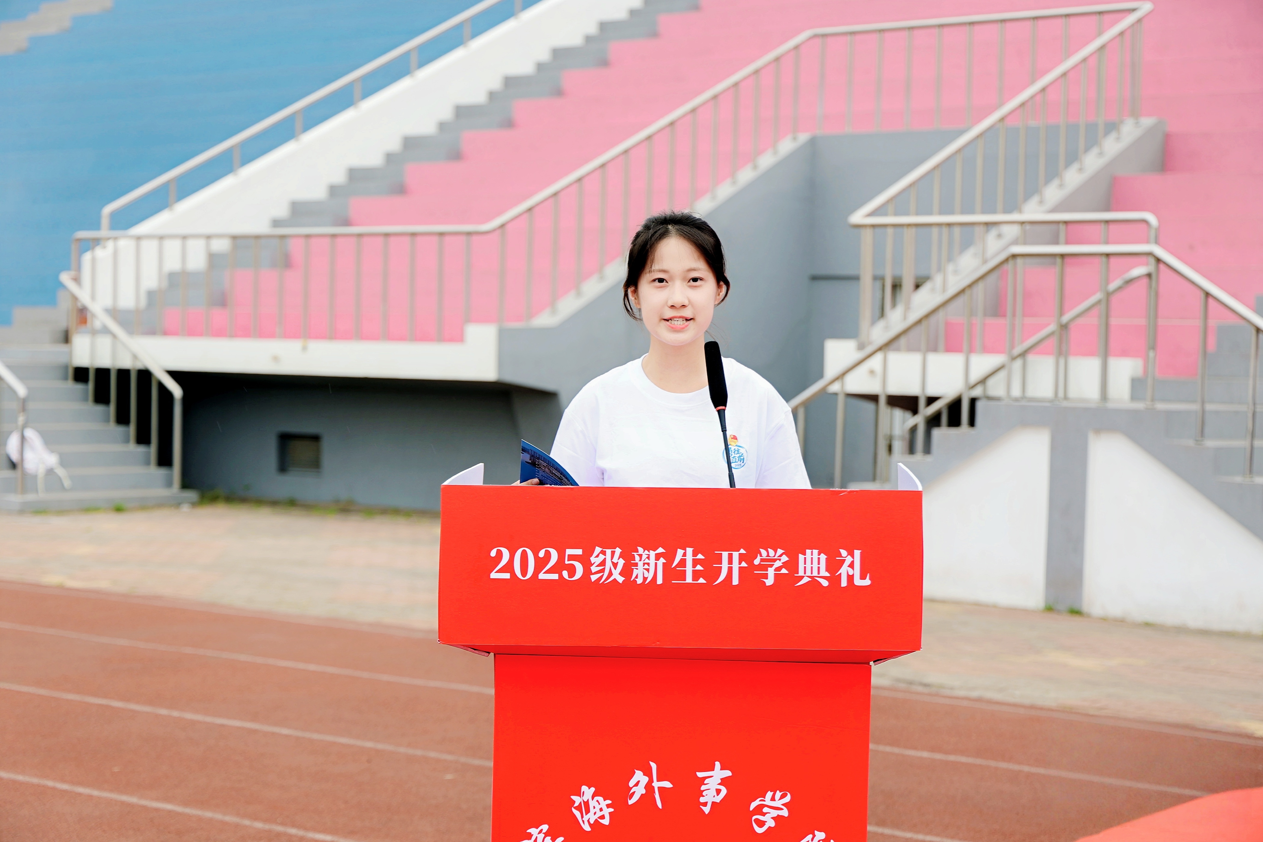新闻传播学系肖宸睿同学代表全体新生向辛勤工作的领导、老师以及学长、学姐表示诚挚的感谢。她分享了自己的学习与生活经历,号召全体新生牢记习近平总书记的嘱托,听党话,跟党走,勇于担当,以更加昂扬的姿态、更加务实的态度,奋勇创新,砥砺前行,携手并肩,全力以赴,奏响滨外新一代学子的青春最强音!