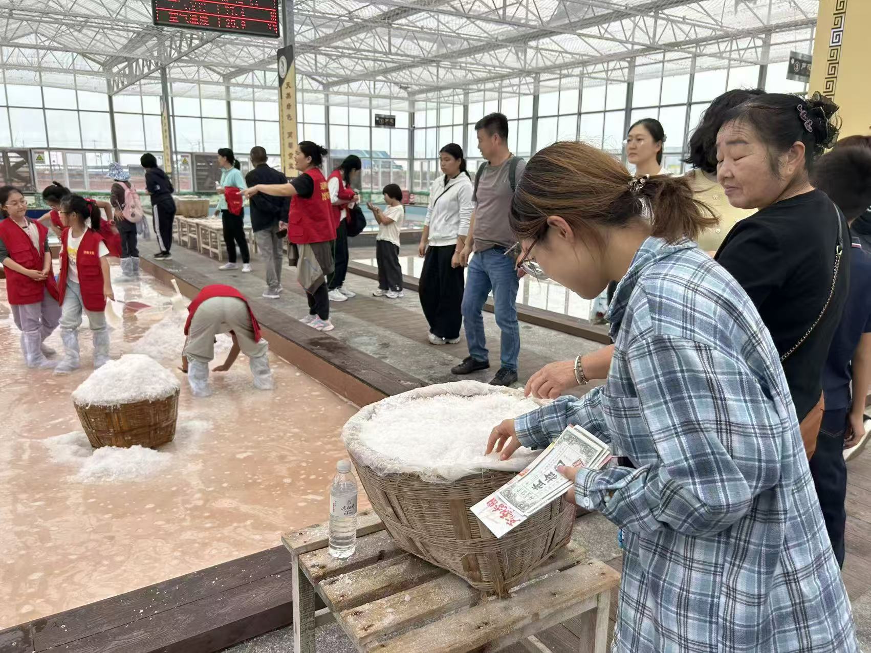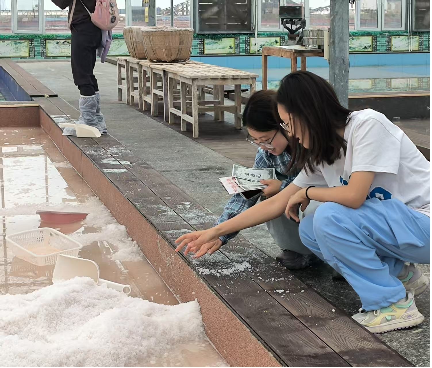 来到古盐田遗址,万亩盐池在阳光下泛着粼粼银光,党员们沿着盐道行走,观察卤水浓度变化对盐晶形成的影响,实地感受“日晒自然结晶”的古老智慧。“原来小小一粒盐,背后藏着这么多地理、化学和人文知识!”学生党员们纷纷感叹,盐业文化的深度与广度远超预期。