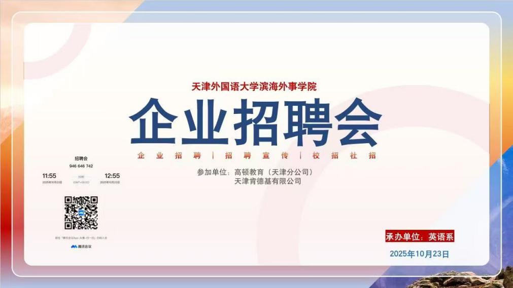 招聘会开场前,英语系通过带有腾讯会议二维码的主题海报发布参会信息,清晰标注企业名单与活动时间,方便学生提前预约参会。会议进程中,高顿教育则同步展示企业环境与业务布局,详解了财经教育领域的管培生、运营岗等岗位需求;天津肯德基以“梦想KFC 好滋味”为主题,通过卡通形象展示、岗位体系解读,介绍了门店运营、管理培训等岗位的成长路径与福利政策,两家企业均针对学生关注的跨专业求职、晋升通道等问题逐一回应。