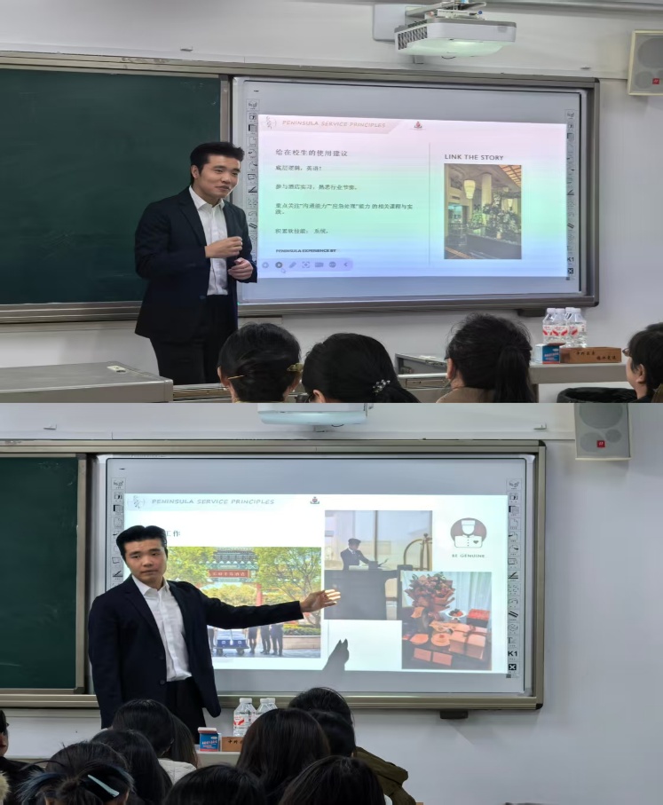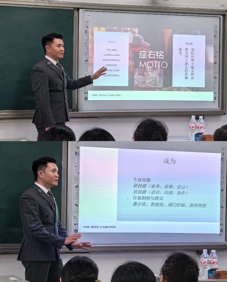 沈照泽以“酒店漫谈:从行业看客到躬身入局”作为宣讲主题,“从选择行业、选择雇主、选择岗位、选择未来”四个方面结合自身从业经历,动员在校学子要积极参与实习,学好英语和酒店信息系统,掌握涉外沟通和应急处理能力,学会做事的逻辑性以及把握行业发展节奏。