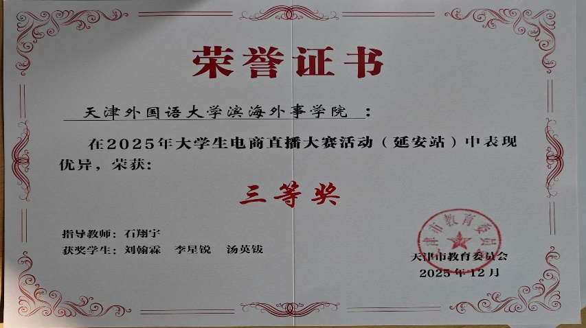 滨外学子荣获“京津冀同上一堂大思政课”暨大学生电商直播大赛三等奖