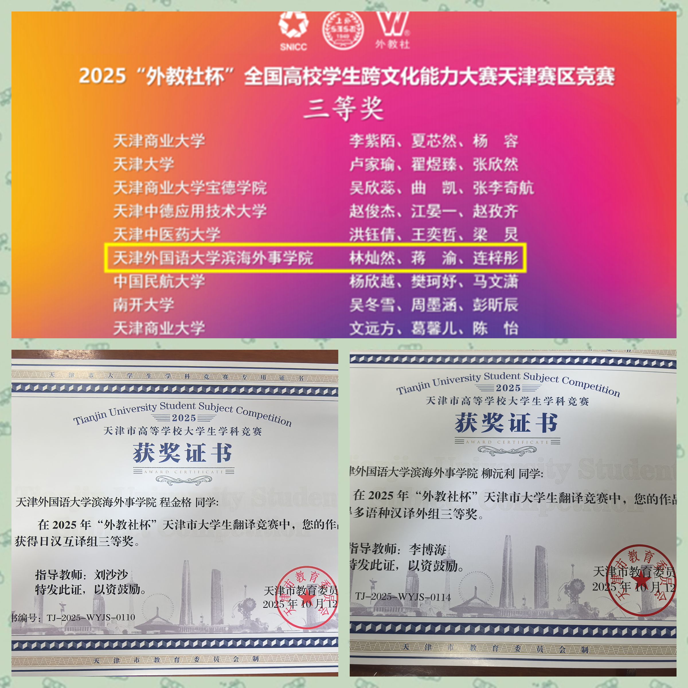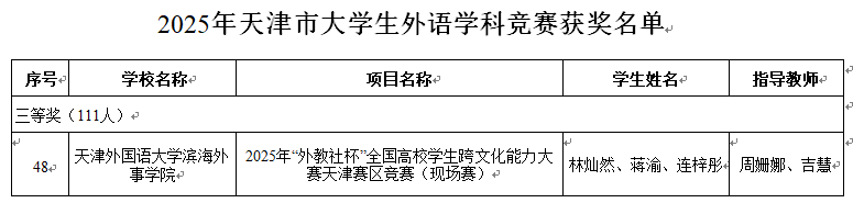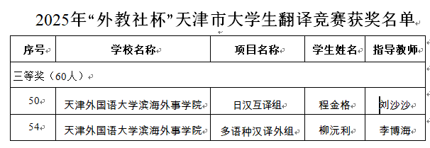 2025年“外教社杯”天津市大学生翻译竞赛:由天津市教委主办、天津外国语大学承办,设英汉互译、日汉互译、多语种汉译外等组别,全市20余所高校2000余名选手参赛,竞争激烈 。2025年“外教社杯”全国高校学生跨文化能力大赛天津赛区:以“坚定文化自信,增进国际理解”为主题,现场赛吸引了全市180支团队、540名选手参与,经情境述评、问答、讲述中国故事等环节层层选拔后评定奖励。